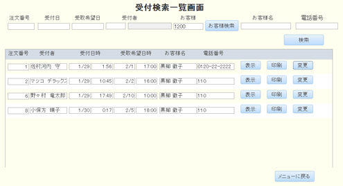 - [注文番号]・[受付日]・[受取希望日]・[受付者]・[お客様番号]・[お客様名]・[電話番号]のいづれかに入力し、[検索]ボタンをクリックすると、指定された条件に合致する受け付けられた注文が検索できる。